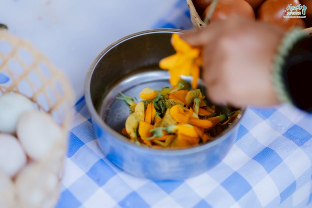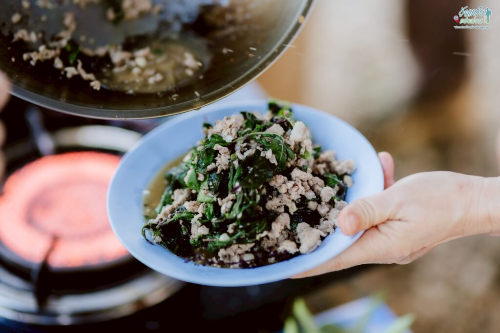 ในช่วงเย็นทำกิจกรรมเก็บผักในสวนนำมาทำอาหาร พร้อมชิมอาหารพื้นถิ่นตามฤดูกาล และชมการแสดงท้องถิ่นที่โครงการโคกหนองนา กลางหมู่บ้าน