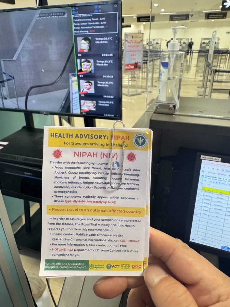 เมื่อวันที่ 24 มกราคม 2569 นายการันต์ ธนกุลจิรพัฒน์ ผู้อำนวยการท่าอากาศยานเชียงใหม่ เปิดเผยว่า จากสถานการณ์การระบาดของไวรัสนิปาห์ที่กำลังเกิดขึ้นในประเทศอินเดียนั้น ท่าอากาศยานเชียงใหม่ได้ประสานความร่วมมือกับ ด่านควบคุมโรคติดต่อระหว่างประเทศ ดำเนินมาตรการเชิงรุกในรูปแบบเดียวกับการเฝ้าระวังโรค COVID-19 และ MERS โดยมีแนวทางปฏิบัติที่สำคัญ ได้แก่ การคัดกรองอุณหภูมิ โดยตรวจวัดอุณหภูมิร่างกายผู้โดยสารขาเข้าระหว่างประเทศทุกรายด้วยเครื่องเทอร์โมสแกน การแจกบัตรคำแนะนำด้านสุขภาพ (Health Beware Card) ให้แก่ผู้โดยสาร เพื่อให้ข้อมูลอาการเบื้องต้นและช่องทางการติดต่อเจ้าหน้าที่หากพบความผิดปกติ และประสานกับเจ้าหน้าที่ด่านตรวจคนเข้าเมือง เพิ่มความเข้มงวดในการตรวจสอบประวัติการเดินทางของผู้โดยสารที่เดินทางมาจากหรือเคยผ่านพื้นที่ระบาดในช่วง 14-21 วันที่ผ่านมา