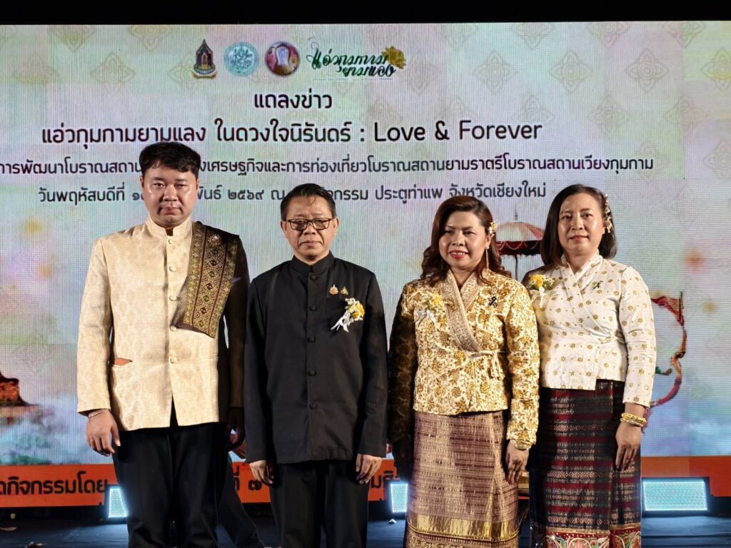เมื่อวันพฤหัสบดี ที่ 19 กุมภาพันธ์ 2569 เวลา 18.00 น. ณ ข่วงประตูท่าแพ อ.เมือง จ.เชียงใหม่ นายชินณวุฒิ วิลยาลัย ผู้อำนวยการสำนักศิลปากรที่ 7 เชียงใหม่ พร้อมด้วย นางสาวปุณณภา สุขสาคร ผู้อำนวยการหอสมุดแห่งชาติรัชมังคลาภิเษกเชียงใหม่ นางเกษราภรณ์ กุณรักษ์ หัวหน้าหอจดหมายเหตุแห่งชาติฯ เชียงใหม่ และนายณัฐพงษ์ แมตสอง หัวหน้าพิพิธภัณฑสถานแห่งชาติหริภุญไชย ได้ร่วมกันแถลงข่าวการเตรียมจัดงานท่องเที่ยวโบราณสถานยามค่ำคืน ณ เวียงกุมกาม “แอ่วกุมกามยามแลง ในดวงใจนิรันดร์ Love and Forever” ในระหว่างวันศุกร์ ที่ 27 กุมภาพันธ์ ถึงวันอาทิตย์ ที่ 1 มีนาคม 2569 เวลา 16.00 น. – 21.00 น. ณ ลานกิจกรรม วัดอีก้าง – วัดหนานช้าง เวียงกุมกาม ตำบลท่าวังตาล อำเภอสารภี จังหวัดเชียงใหม่