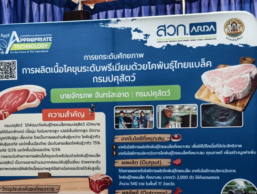 อุตสาหกรรมโคเนื้อไทยกำลังยืนอยู่บนจุดเปลี่ยนสำคัญ ผลผลิตลดลงจากโรคลัมปีสกิน ต้นทุนอาหารสัตว์พุ่งสูง ขณะที่ความต้องการเนื้อพรีเมียมในประเทศเพิ่มขึ้นต่อเนื่อง แต่กำลังผลิตยังไม่พอจนต้องนำเข้ามากกว่า 2 ล้านตันต่อปี กระทบทั้งความมั่นคงอาหารและขีดความสามารถการแข่งขันของประเทศในระยะยาว ARDA สนับหนุนงานวิจัยให้ กรมปศุสัตว์พัฒนา “โคไทยแบล็คกรมปศุสัตว์” โคเนื้อพรีเมียมที่ผสมระหว่างวากิว แองกัส และโคพื้นเมืองไทย จนได้โคที่ทนร้อน เนื้อนุ่ม และให้เกรดเนื้อสูงกว่าเกณฑ์ทั่วไปอย่างชัดเจน พร้อมช่วยเพิ่มรายได้เกษตรกรถึง 30,000–40,000 บาทต่อตัว